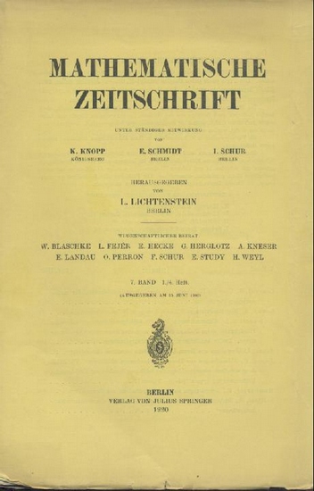 Mathematische Zeitschrift. Unter stÃ?ndiger Mitwirkung von Konrad Knopp, Erhart Schmidt u. Issai Schur hrsg. v. Leon Lichtenstein. 7. Band. Springer, Berlin 1920. 323 Seiten. Brosch. Geringe Gebrsp. Unaufgeschnitten. Sehr gutes Exemplar. - BeitrÃ?ge: R. Courant, H. Hamburger, P. Koebe, L. Lichtenstein, A. Loewy, R. v. Mises und I. Schur. Aus der Bibliothek des Freiburger Mathematikers Bernhard Merten, Studienkollege und lebenslanger Freund des Philosophen Rudolf Carnap.