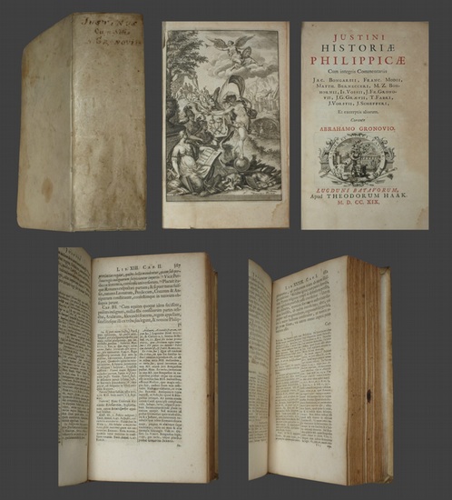 Justini Historiae Philippicae. Cum integris Commentariis Jac. Bongarsii, Franc Modii, Matth. Bernecceri, M. Z. Boxhornii, Is. Vossii, J. Fr. Gronovii, J. G. Graevii, T. Fabri, J. Vorstii, J. Schefferi, et excerptis aliorum. Curante Abrahamo Gronovo. Leiden, Theodor Haak, 1719. 19,5x12,5x7 cm. 1 gest. Frontispiz (Allegorie von F. Bleyswyck), Titelbl. mit gest. Vignette, 17 Bl., 832 S., 83 Bl. Index. Pergament der Zeit mit 5 durchzogenen Bünden, hs. Rücketitel. Mit Besitzervermerk (alt) "Sigism. Spoendlini 1734". Etwas altersfleckig, anfangs schwach wasserrandig.