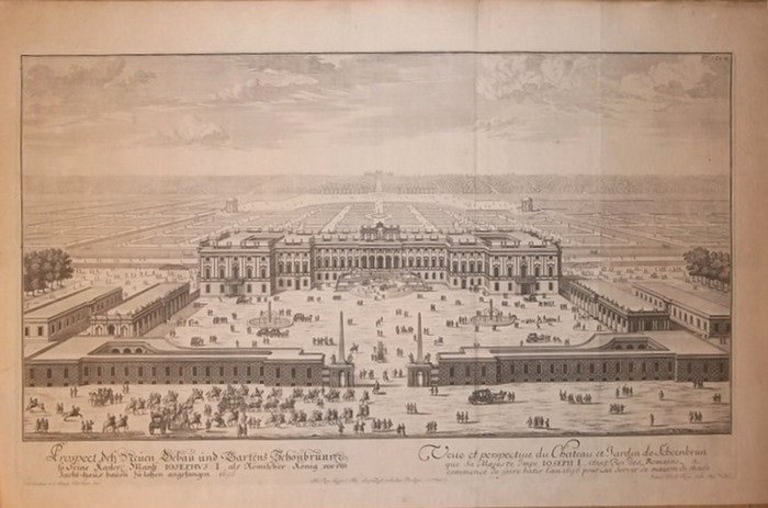 "Prospect deß Neuen Gebäu und Gartens Schönbrunn ...". Kupferstich von Johann U. Krauss nach J. B. Fischer von Erlach. Aus: Johann Bernhard Fischer von Erlach: Entwurff Einer Historischen Architectur. Wien, Selbstverlag, 1721. Ca. 40 cm x 65 cm. Nebehay-W. 176, 3. Thieme-B. XII, 48: "Fischer von Erlach hat auch ein bemerkenswertes kunstliterarisches Werk veröffentlicht, den `Entwurf einer historischen Architektur`, den man als Vorläufer kunstgeschichtlicher Architekturforschung bezeichnet hat". - Gebräunt und leicht fleckig. Mehrere Knickfalten.