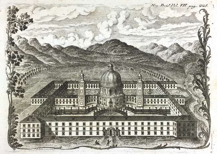 Orig. - Kupferstich mit der Ansicht des Klosters Ettal. (München, 1766). Orig. - Kupferstich im Format ca. 18 x 25 cm (Bildgröße) + Papierrand. = Kupferstich - Ansicht des Klosters Ettal aus den Monumenta Boica, Vol. VII. Klarer und sauberer Abdruck. Unter Passepartout.