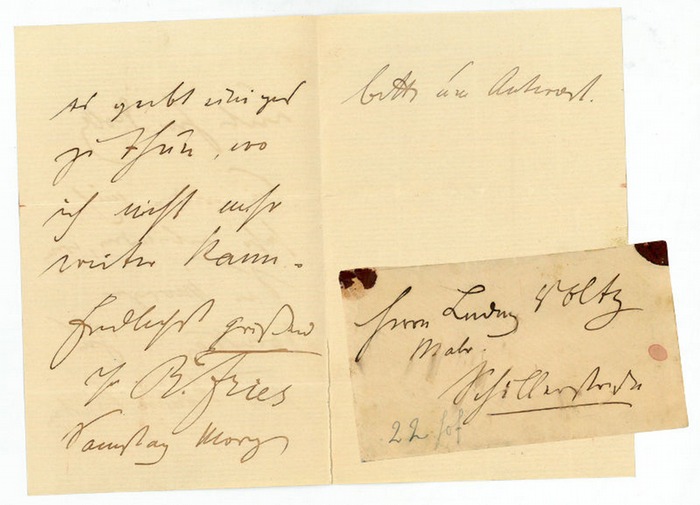 Eigenh. Brief mit U. O. O. u. D. 1? SS. auf Doppelblatt. 8vo. Mit eh. Kuvert. An den Maler Ludwig Voltz (1825-1911): ?Sie würden mich sehr verbinden, wenn Sie morgen vormittag zu mir kommen könnten. Es gibt einiges zu thun, wo ich nicht mehr weiter kann [...]?. - Nach Studien in Karlsruhe und München lebte Fries von 1838-41 in Rom. Nach seiner Rückkehr 1842 sich vornehmlich im Kreis der Düsseldorfer Schirmerschule bewegend, lebte und arbeitete er in Genf, von wo - nach München zurückgekehrt - er in den Kreisen um Bonaventura Genelli (1798-1868), Carl Rahl (1812-1865), Daniel Fohr (1801-1862) und Johann Baptist Berdellé (1813-1876) verkehrte. Die Revolution von 1848 veranlaßte ihn, sich zunehmend mit sozialen Fragen auseinanderzusetzen, was schließlich 1852 seine Ausweisung aus Bayern zur Folge hatte. Nach einem neuerlichen Aufenthalt in Rom - wo sein bedeutendstes Werk, ein Zyklus von vierzig italienischen Landschaften nach dem Vorbild Rottmanns, entstand -, konnte er 1854 bleibend nach München zurückkehren, wo er u. a. im Kreise von ?D. Strauß, L. Feuerbach, Fr. v. Stauffenberg, Dr. Marquardsen u. a. verkehrte und offen zur nationalliberalen Partei übertrat? (Thieme/B. XII, 476f.).