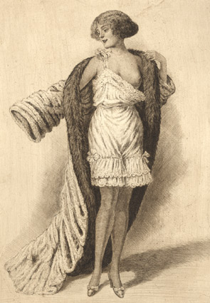 Lilly. Original-Radierung. Um 1915. Motiv: 23 x 16 cm. Blattgröße 33 x 24,5 cm. Gekonnte erotische Radierung eines unbekannten Künstlers. Sie zeigt die Vorderansicht einer jungen Frau. Unter ihrem bodenlangen Pelzmantel trägt sie nur ein Unterkleid; ein Träger ist verrutscht und zeigt einen Busen. Handschriftlich betitelt. Ränder leicht fingerfleckig. Guter Zustand. ------------------------- English description available on request. Traduction française sur demande.