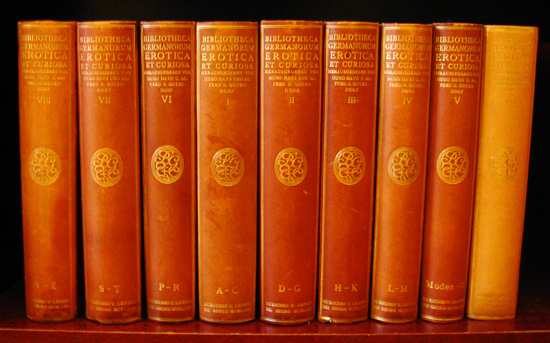 Bibliotheca Germanorum Erotica & Curiosa. Verzeichnis der gesamten deutschen erotischen Literatur mit Einschluß der Übersetzungen, nebst Beifügung der Originale. Zugleich dritte, ungemein vermehrte Auflage von Hugo Hayns "Bibliotheca Germanorum erotica". München, Georg Müller, 1912-1914, Bd. IX: 1929 hier als unveränderter Reprint: Hanau, Müller & Kiepenheuer, 1968. 9 Bände. Gr. 8°. Orig.-Halbleder mit Lederecken. Goldgepr. Rückentitel. Originalausgabe dieser wichtigsten Bibliographie zur deutschen erotischen Literatur, die ca. 60000 Titel verzeichnet. Berieben, Kanten und Kapitale teils beschabt. Sonst gutes Exemplar. Dabei: Band IX (Ergänzungsband). Hrsg. von Paul Englisch. Dieser Band erschien 1929 und liegt hier als unveränderter Reprint vor. Hanau, Müller & Kiepenheuer, 1968. Ebenfalls Halbleder mit RTitel. ----- Troisième tirage, extrêmement augmenté, de la "Bibliotheca Germanorum erotica" de Hugo Hayn. 9 vol. Munich, G. Müller, 1912-1919. Vol. 9 reproduction fac-simile : Hanau, Müller & Kiepenheuer, 1968. Grand in-8°. Demi-chagrin à coins de l'éditeur, dos avec titre en lettres dorées. Reliures frottées, coiffes et bords légèrement égratignés. --------- English description available on request.