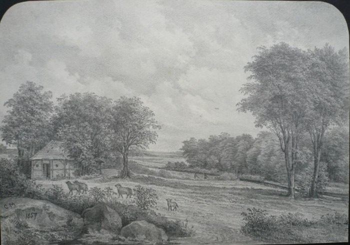 Schafstall auf Silk am Flusse der Bille (Reinbek). Bleistiftzeichnung. 1857. Monogrammiert "C M" und datiert. Rücks. auf einem Klebeetikett von alter Hand bezeichnet "Schaafstall auf Silk am Flusse der Bille". 20 x 28,5 cm. Blattfüllende, bildhaft ausgeführte und detailliert gezeichnete Landschaft. Die kleine Fachwerkscheune ist im Mittelgrund von hohen Bäumen umgeben, im Vordergrund grasen Schafe. Weiter hinten sind Menschen bei der Arbeit auf dem Feld zu sehen. - Die oberen Ecken sind gerundet.