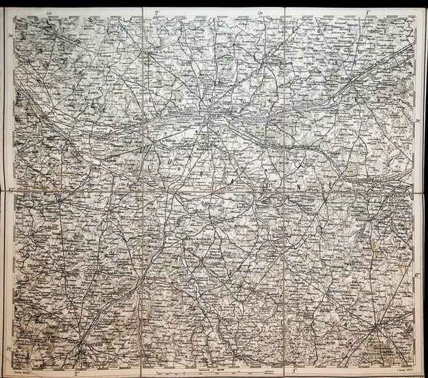 TOURS- [Blatt A. 7 der General-Karte von Central Europa 1:300000 1873-1876] Wien, Kaiserlich und K?nigliches Milit?r-Geographisches Institut, 1876. Heliogravure in Kupfer vervielf?ltigt durch Umdruck vom Steine., Blatt ca. 51x 45 cm, Kartenbild; ca. 48 x 42 zu 6 Segmenten auf Leinen aufgezogen; Zustand: sehr gut. Generalkarte von Zentraleuropa / Generalcarte von Centraleuropa / 1:300 000 / 1 : 300. 000. Die Generalkarte von Central Europa erschien in den Jahren 1873 bis 1876, sie ist das Werk von Joseph Ritter von Scheda (1815-1888) Nach seiner milit?rischen Ausbildung in Graz, wurde recht bald seine besonderen F?higkeiten f?r das Kartenzeichnen erkannt. Ab 1842 begann seine steile Karriere beim Wiener Milit?rgeographischen Institut. Zun?chst Leiter der Lithographischen Abteilung des Wiener Milit?rgeographischen Instituts sp?ter zeitweise auch der Kupferstichabteilung. War er ab 1869 Chef der Abteilungen Topographie, Lithographie und Kupferstich somit der gesamte Bereich der kartographischen Arbeiten des Instituts. Sein unerm?dliches Bestreben um Verbesserung der technischen und inhaltlichen Qualit?t der Karten trug er wesentlich zur Begr?ndung des Weltrufs des Wiener Milit?rgeographischen Instituts bei. Der hier angebotenen Karte gingen folgende Arbeiten voraus: 1845-47 General-Karte von Europa in 25 Bl?ttern Lithographie, General-Karte des ?sterreich. Kaiserstaates mit einem grossen Theile der angr?nzenden L?nder 20 Blatt in Kupferstich 1: 576 000, in der 2. Auflage 1870-1871 General-Karte von Central-Europa in 47 Bl?ttern, wobei diese Kartenwerke nach eigenen Zeichnungen Schedas im Institut auf seine Kosten produziert wurden. Wegen der hervorragenden Qualit?t wurde konnte die 1 : 576 000 Karte auf dem Ma?stab 1 : 300 000 vergr??ert werden, wodurch mit einem Schlage 207 Bl?tter der Generalkarte vorlagen. Vgl. ADB 53, S. 737 f. / NDB, 22, S. 598 f. / ?BL 10, S. 56 f. / Die Amtliche Kartographie ?sterreichs Wien 1970, S. 28, dieses Kartenwerk blieb bis zu der Generalkarte von Mitteleuropa 1: 200 000 Wien, k. k. milit?rg. Inst 1889-1912 der Standard.