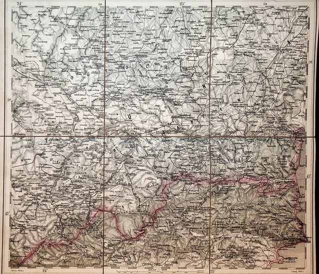 SUMLA - [Blatt P. 11. der General-Karte von Central Europa 1:300000 1873-1876] Wien, Kaiserlich und K?nigliches Milit?r-Geographisches Institut, 1876. Heliogravure in Kupfer vervielf?ltigt durch Umdruck vom Steine., Blatt ca. 51x 45 cm, Kartenbild; ca. 48 x 42 zu 6 Segmenten auf Leinen aufgezogen; Zustand: gut, teilkoloriert. Generalkarte von Zentraleuropa / Generalcarte von Centraleuropa / 1:300 000 / 1 : 300. 000. Die Generalkarte von Central Europa erschien in den Jahren 1873 bis 1876, sie ist das Werk von Joseph Ritter von Scheda (1815-1888) Nach seiner milit?rischen Ausbildung in Graz, wurde recht bald seine besonderen F?higkeiten f?r das Kartenzeichnen erkannt. Ab 1842 begann seine steile Karriere beim Wiener Milit?rgeographischen Institut. Zun?chst Leiter der Lithographischen Abteilung des Wiener Milit?rgeographischen Instituts sp?ter zeitweise auch der Kupferstichabteilung. War er ab 1869 Chef der Abteilungen Topographie, Lithographie und Kupferstich somit der gesamte Bereich der kartographischen Arbeiten des Instituts. Sein unerm?dliches Bestreben um Verbesserung der technischen und inhaltlichen Qualit?t der Karten trug er wesentlich zur Begr?ndung des Weltrufs des Wiener Milit?rgeographischen Instituts bei. Der hier angebotenen Karte gingen folgende Arbeiten voraus: 1845-47 General-Karte von Europa in 25 Bl?ttern Lithographie, General-Karte des ?sterreich. Kaiserstaates mit einem grossen Theile der angr?nzenden L?nder 20 Blatt in Kupferstich 1: 576 000, in der 2. Auflage 1870-1871 General-Karte von Central-Europa in 47 Bl?ttern, wobei diese Kartenwerke nach eigenen Zeichnungen Schedas im Institut auf seine Kosten produziert wurden. Wegen der hervorragenden Qualit?t wurde konnte die 1 : 576 000 Karte auf dem Ma?stab 1 : 300 000 vergr??ert werden, wodurch mit einem Schlage 207 Bl?tter der Generalkarte vorlagen. Vgl. ADB 53, S. 737 f. / NDB, 22, S. 598 f. / ?BL 10, S. 56 f. / Die Amtliche Kartographie ?sterreichs Wien 1970, S. 28, dieses Kartenwerk blieb bis zu der Generalkarte von Mitteleuropa 1: 200 000 Wien, k. k. milit?rg. Inst 1889-1912 der Standard.