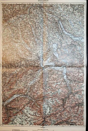 Z?rich - Land: Schweiz (= General-Karte von Mittel-Europa 1:200 000. 137. 26? 47?) Wien, Kaiserlich-K?nigliches Milit?r-Geographisches Institut, [um 1900]. Hochformat, ca. 38 x 55 cm, gefaltet zu 4 Segmenten, Ausgabe: mehrf?rbig; Zustand: gut +. Blatt 137 von 282 vgl. Regele, Oskar: Beitr?ge zur Geschichte der staatlichen Landesaufnahme und Kartographie in ?sterreich bis zum Jahre 1918. Wien, Verlag des Notringes der wissenschaftlichen Verb?nde ?sterreichs, 1955. S. 84.
