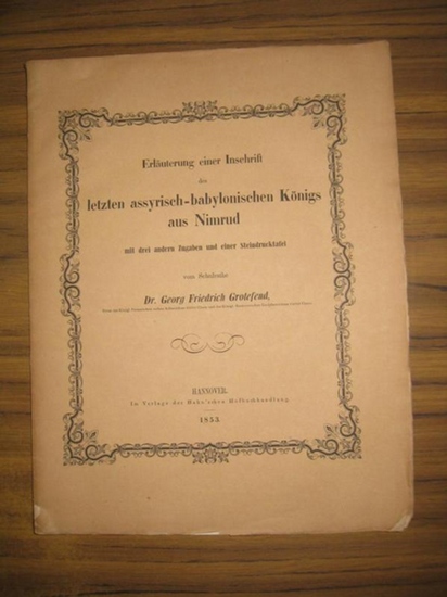 Erläuterung einer Inschrift des letzten assyrisch-babylonischen Königs aus Nimrod mit drei andern Zugaben und einer Steindrucktafel. Hannover Hahn 1853. Erstausgabe. 4° ( 27,8 : 22,5 cm). Originalbroschur. Der Umschlag etwas lichtgedunkelt und mit kleinen Randläsionen. Am Rücken bis zu 4 cm Fehlstelle. 44 Seiten mit einer Steindrucktafel der Keilinschrift. Durchgehend im Randbereich gebräunt / etwas braunfleckig. Unaufgeschnitten. Gutes Exemplar. FL01198-316009.