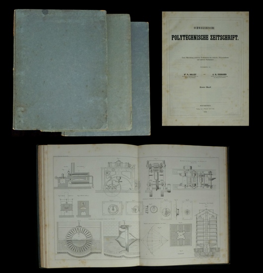 Schweizerische polytechnische Zeitschrift. Winterthur, J. Wurster und Comp., 1856-1858. 4°. VI, 192 S. mit 25 (17 doppelblattgr.) Tafeln; V, 186 S. mit 17 (11 doppelblattgr.) Tafeln; V, 184 S. mit 21 (6 doppelblattgr.) Tafeln und 2 n.n. Karten. Alle Tafeln in Lithographie. Schlichte Pappbände mit Papierrückenschildern. 1.-3. Band. Bei Band 3 ist die Karte 5 der Vereinigten Schweizerbahnen falsch nummeriert: statt Nr. 15 Nr. 17, diese doppelt nummeriert [Karte V und VII]. - (Einbände etwas berieben, fleckig und an den Ecken bestossen. Name auf Vorsätzen. Stockfleckig).