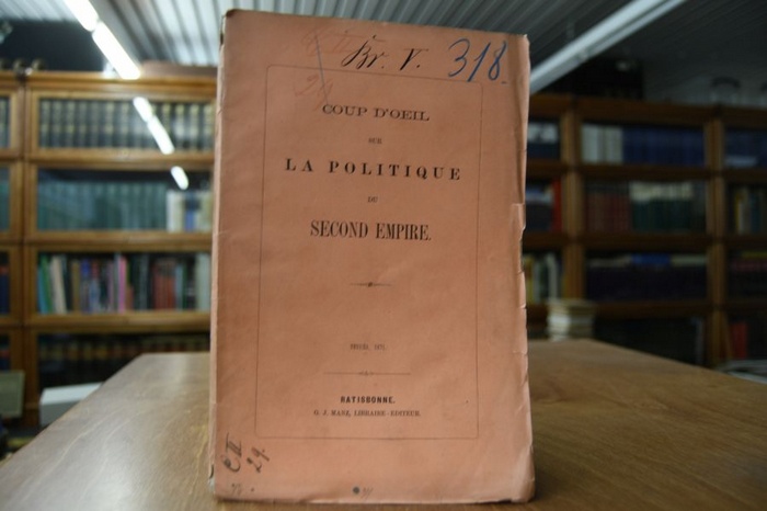 Coup d`oeil sur la Politique du Second Empire. Regensburg, Manz, 1871. 72 S. 24 x 15 cm, Broschur. Bibliotheksband mit den üblichen Eintragungen. Einband berieben, bestoßen und mit Einrissen. Innen sauber und gut. Unbeschnittene Seitenränder angeschmutzt.