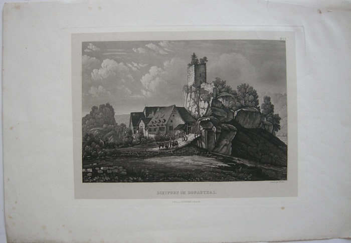 "Dietfurt im Donauthal". Teilansicht der Ortschaft mit Blick auf die Ruine. Orig. Aquatinta-Radierung aus "Malerische Reise der Donau von ihrem Ursprung bis zu ihrem Verschwinden" von J. Weber, bei Locher in Zürich, um 1835. _. 16,5 x 24 cm Blattgröße 29 x 42 cm. Nebehay-Wagner 371, 7. Dietfurt im Landkreis Sigmaringen gehört heute zur Gemeinde Itzigkofen. - In den Rändern leicht braunfleckig, schönes Exemplar.