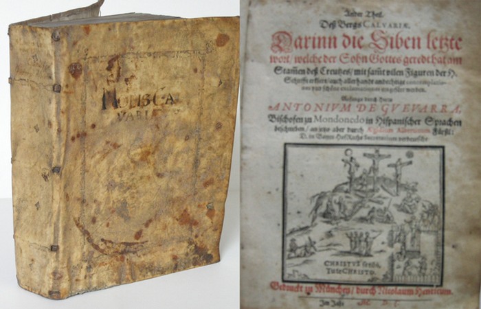 Ander Theil deß Bergs Calvariae, Darinn die Siben letzte Wort, welche der Sohn Gottes geredt hat am Stamen deß Creutzes, mit samt vilen Figuren der H. Schrifft erklert, auch allerhandt andechtige contemplationes und schöne exclamationes eingefürt werden. Anfangs durch Herrn Antonium de Guevarra, Bischoffen zu Mondonedo in Hispanischer Sprachen beschrieben, anjetzo aber durch Aegidium Albertinum Fürstl. D. in Bayrn HofRaths Secretarium verdeutscht. München, Henrich, 1600. 8 Bl., 304 (recte 301) num. Blatt, 3 Bl., Titelholzschnitt. 4°, Pergament der Zeit. VD17 12:106428F (für Ausgabe München, Henrich 1610). Erste deutsche Ausgabe des 2. Teils des "Monte Calvario" (erste spanische Ausgabe Valladolid 1549). Aus verarmtem Adel stammend kam der Franzikaner Antonio de Guevara (1480-1545) in jungen Jahren an den Hof von Karl V. und bekleidete später hohe Ämter, was ihn nicht davon abhielt, in seinem Buch "Menosprecio de corte y alabanza de aldea" eine Abkehr vom Hofleben hin zum Landleben zu empfehlen. als fantasievoller Historikger erfand antike Vorlagen und reicherte vorhandene Vorlagen mit erfundenen Darstellungen an. - Einband stärker berieben und fleckig, innen durchgängig teils stärker braunfleckig.