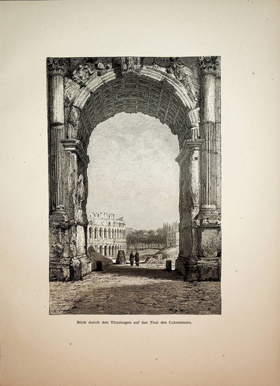 ROMA / ROME / ROM Arco di Tito + Colosseo, Arch of Titus and Colosseum, Titusbogen und Kolosseum, Italia, Veduta ca. 1880 ca. 1880. original xilografia, Xylographie Format ca. 36 x 26 cm. Antique Print, antike Grafik.