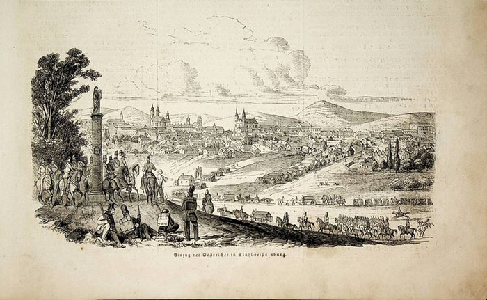 SZ?KESFEH?RV?R / Stuhlwei?enburg Ansicht, view ca. 1849 antike Grafik, print ca. 1849. original Xylographie, Darstellung ca. 13 x 22,5 cm. Antique Print, antike Grafik.