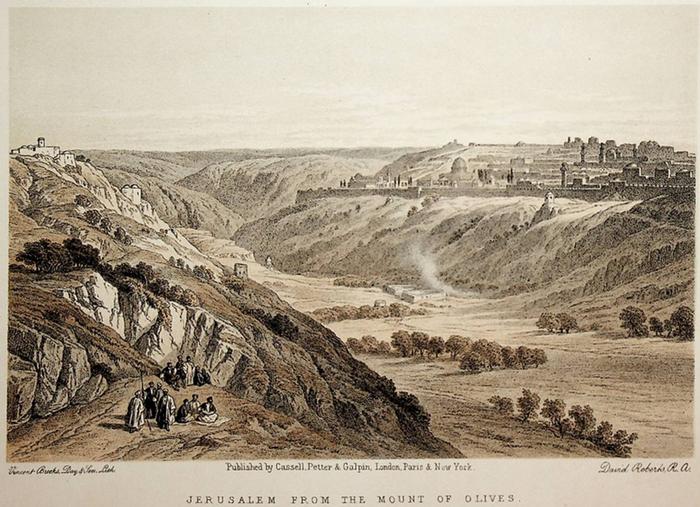 JERUSALEM FROM THE MOUNT OF OLIVES. antique print. London, Paris & New York, Cassell Petter & Gaplin, n. d. ca. 1870-1875. original Lithograph Vincent Brooks, Day & Son after David ROBERTS (1796-1864), image format ca. 15 x 22,5 cm. Antique Print, antike Grafik.