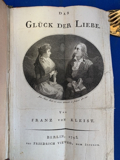 Das Glück der Liebe. Berlin, Vieweg d.Ä. 21 S. (incl. Vignette). Mit großer gestochener Titel-Vignette in Aquatinta von J. F. Bolt. Oktav, Ganzleder-Spitzeneinband. Goed. V, 459, 13. Kosch VIII 1287. Hayn-Got. III 572: Erste Ausgabe "Mit reizender Titelvignette." (ausfaltbar) in äußerst dekorativen Spitzeneinband mit reichlicher Goldverzierung auf dem Rücken und goldgeprätem Titelrückenschild. Die Porträt-Titelvignette (abgebildet Lanckoronska II, 89) ist identisch mit einem eigenständigen lithographischen Porträts Kleists mit der Bezeichung " Franz Alexander von Kleist (und dessen Familie)" und nicht, wie Koennecke im Bilderatlas zur Gesch. der dt. Nationallit. (Marburg 1887), S. 234 meint, die Familie Schillers. Aus der "Goethe-Sammlung Edwin Redslob" dessen Sammlung zum überwiegenden Teil mit der Stiftung seines Freundes Anton Kippenberg in Düsseldorf zur weltweit größten privaten Goethe-Sammlung vereinigt wurde.Die Witwe von Redslob gab nach seinem Tod einige Bände der Bibliothek zu Auktionen.
