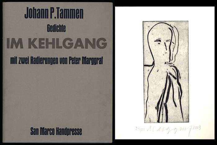 Im Kehlgang. Mit zwei Radierungen von Peter Markgraf. [Signiertes Exemplar, 2 Originall-Radierungen]. Bordenau Venezia, San Marco Handpresse, 2003. 4°. 29,5 cm. 23 S 2 Radierungen. Original-Broschur. Nummer 21 von 23 nummerierten und von Johann P. Tammen und Peter Markgraf signierten Exemplaren mit 2 lose beiliegenden Original-Radierungen ("Ohne Titel" und "Mit der Aureole") von Peter Markgraf ebenfalls nummeriert, signiert und datiert (2003). Maße Blätter: 28,5 x 21,5 cm. Maße Abbildungen: 19,8 x 17,5 bzw. 19,8 x 9,5 cm. Schutzumschlag wenig angstaubt, wenig knitterig, ansonsten sehr gutes Exemplar. Number 21 of 23 copies of the limited edition, signed and with 2 original etchings by Peter Markgraf. Nearly fine condition.