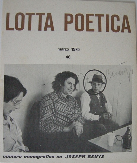 Lotta Poetica. Marzo 1975. Nr. 46. Numero monografico su Joseph Beuys. Brescia, Lotta Poetica, 1975. 12 Bl. 4°, Orig. Broschur. Monografische Nummer der Zeitschrift "Poetischer Kampf", Joseph Beuys gewidmet, 22 ganzseitige Fotos von Kunst-Aktionen von Beuys, 1 Blatt Pamphlet "Organisation für direkte Demokratie durch Voksabstimmung". Vorderdeckel von Beuys mit Bleistift signiert und sein Foto mit Filzstift eingekreist. - schönes Exemplar.