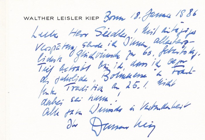 Konvolut von 14 Schreiben aus Politik und Wirtschaft an den Verleger Wolf Jobst Siedler. Briefe und Karten im Umfeld des 60. Geburtstags Siedlers im Jahr 1986. Berlin., 1986. Verschiedene Formate. ca. 25 S. Original-Briefe und Karten, maschinen- und handgeschrieben, mit Datierungen und handschriftlichen Signaturen. Gut erhalten. Das Konvolut enthält insgesamt 14 Schreiben aus Politik und Wirtschaft an den für die alte Bundesrepublik bedeutenden Verleger Wolf Jobst Siedler. Siedler war seit Anfang der 1960er Jahre als konservativ-kritischer Journalist, Essayist und Verleger in Westberlin tätig. Insbesondere seine verlegerische Tätigkeit im Siedler Verlag machte ihn für viele Menschen in der BRD zu einem bedeutenden Zeitgenossen. Im Januar 1986 feierte der Verleger seinen 60. Geburtstag, mit Würdigungen in allen wichtigen Medien der westdeutschen Öffentlichkeit. Das vorliegende Konvolut umfasst längere Briefe und Karten an den Verleger, einschlägig aus der Politik der BRD und West-Berlins. Enthalten sind Schreiben von Walther Leisler Kiep, Hartmut Jäckel, Walter Wallmann, Hans-Jochen Vogel, Dietrich Stobbe, Oscar Schneider, Horst Schirmer, der Stiftung Bundeskanzler Adenauer Haus, Friedhelm Ost, Anke Martiny, Sieghardt von Köckritz, Wilhelm A. Kewenig, Claus-Jürgen Duisberg und Otto Esser. Die Schreiben umfassen meist eine Seite, teils auch 2-3 Seiten. Sie gehen über den Anlaß des Jubiläums deutlich hinaus, hier werden private und berufliche Bindungen erkennbar. Auch die tiefe Verehrung, die der Verleger in (nicht nur) konservativen Milieus der alten BRD erfuhr wird hier sichtbar. Schon Walter Wallmann (Oberbürgermeister Frankfurt am Main) schrieb: "Ihre Essays, lieber Herr Siedler, aber auch ihre Verlagsarbeit in den letzten Jahren haben sehr viel dazu beigetragen, daß es in Deutschland wieder so etwas wie einen Konservatismus im Geistigen gibt [...]". Auch Hans-Jochen Vogel, damals Vorsitzender der SPD-Bundestagsfraktion, würdigte an Siedler "den wichtigen Beitrag, den Sie zuletzt als erfolgreicher Verleger zur kulturellen Entwicklung unseres Volkes geleistet haben". Dietrich Stobbe (MdB) formulierte in seinem Brief kurzum: "Sie sind ein Prachtberliner, lieber Herr Siedler." Die SPD-Politikerin Anke Martiny schrieb in ihrem handschriftlich verfassten zweiseitigen Brief: "Ich habe viel durch Sie gelernt in den Berliner Wahlkampfmonaten und den geistreichen Charme des Umgangs besonders geschätzt in dieser für mich so schweren Zeit, dafür bin ich dankbar [...]". Der Ministerialdirektor (Bundesinnenministerium) Sieghardt von Köckritz geriet in seinem zweiseitigen Schreiben ins Fabulieren, wenn er schrieb: "Von ihren Büchern und Gedanken sind Wirkungen ausgegangen. Sie haben zu Besinnung und Rückbesinnung aufgerufen und Zukünftiges miteinbezogen. Sie sind ein großer Anreger, wie es ihn sonst nicht gibt. [...] Wenn die Zeiten wären, wie sie nicht mehr sind, würde ich des preußischen Königs Majestät empfehlen, dem Herrn Siedler zu seinem Festtag als Zeichen der Dankbarkeit, der Huld und der Zuneigung allergnädigst zu gewähren den Schwarzen Adler, ein Gut in der Mark und eine fein lackierte Kutsche. So Sie es denn nicht schon hätten. Immerhin bleibt die Idee und der Traum von dem, was eigentlich passend wäre für einen Menschen, in dessen Herzen sich Klassizismus, Moderne und Fortschritt so freundlich durchdringen [...]". Otto Esser, damals Präsident der Bundesvereinigung der Deutschen Arbeitgeberverbände, erinnert sich in seinem kürzeren Brief an die Siedler-Rede für Ernst Jünger 1982 und schreibt dazu: "Sie gaben ihr den Titel 'Die Entzifferung der Zeichen'. Mir scheint, daß ihre Bemühungen nichts anderes zum Gegenstand haben." Sehr interessantes Konvolut (Unikat) mit Einblicken in die Geschichte eines Verlegers und seiner vielfältigen Verehrer in der Bundesrepublik! - - - ACHTUNG! Dieses Buch kann wegen seines Gewichts oder seiner Größe nur als PAKET verschickt werden. Innerhalb Deutschlands 5,80 Euro. (Portokosten ins Ausland bitte erfragen.) / ATTENTION! Due to its weight or size this book can only be sent as a PARCEL. Within Germany 5,80 Euro (For shipment abroad please ask.).