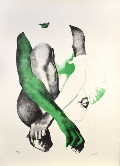 Surreale Komposition. [19]68. [Signierte Original-Farblithografie / signed original color lithograph]. _. Hans Jürgen Diehl, geboren am 22. Mai 1940 in Hanau. Deutscher Maler des Neuen Realismus und Professor für Malerei an der Universität der Künste Berlin. Meisterschüler von Hann Trier. Gründungsmitglied der Ausstellungsgemeinschaft Großgörschen 35, Mitglieder waren die Künstler Ulrich Baehr, Werner Berges, Peter Sorge, Maina-Miriam Munsky, Wolfgang Petrick und Lambert Maria Wintersberger an. Die Künstler stehen in der Berliner Kunstszene für einen kritischen und sozialkritischen Realismus, der an die Neue Sachlichkeit der 1920er Jahre anschließt. Nummer 41 von 50 nummerierten Original-Farblithografien auf Büttenpapier, von Hans Jürgen Diehl unterhalb der Abbildung in Blei signiert und datiert (68). Maße Blatt: 76,0 x 55,0 cm. Maße Abbildung: 58,5 x 42,0 cm. Blatt minimal fleckig. Insgesamt sehr gutes Exemplar. Surreal composition. [19]68. Number 41 of 50 numbered original color lithographs on handmade paper, signed and dated (68) in lead by Hans Jürgen Diehl below the illustration. Dimensions sheet: 76.0 x 55.0 cm. Dimensions illustration: 58.5 x 42.0 cm. Sheet minimally stained. Overall a very good copy.