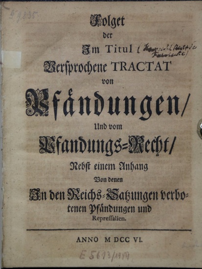 Tractat von Pfändungen und vom Pfandungs-Recht. Nebst einem Anhang von denen in den Reichs-Satzungen verbotenen Pfändungen und Repressalien. (Celle, Hoffmann), 1706. 95 Seiten. 20 x 15,5 cm. Neuerer Halbleinenband. *Gleichmäßig etwas gebräunt insgesamt gut erhalten.