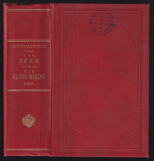 SCHEMATISMUS für das kaiserliche und königliche Heer und für die kaiserliche und königliche Kriegs-Marine für 1900 Wien, k. k. Hof- und Staatsdruckerei 1899. Amtliche Ausgabe. Tit., 1468 S. u. 1 mehrf. gefalt. farb. Karte. OLn. mit Rückengoldpräg. Vorderdeckel, Vors. u. Tit. gestemp. Exlibris. Einzelne Textanstreichungen.