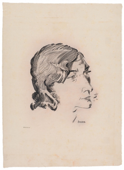 Maria Eis. Frauenkopf nach rechts. _. Lithographie,1935, auf cremefarbenem Japan-Bütten, im Stein signiert und mit Bleistift als "Probedruck" bezeichnet. Blattgröße 52,2:38 cm. - Knickfalte im unteren Bereich des Blattes, leicht braunfleckig und Spuren von Rötel. Probedruck mit Bleistiftkorrekturen und zur Übertragung auf den Stein ist der Papierbogen verso gerötelt. Literatur: Nicht mehr bei Stix/Osborn; Papst L 25 (hier fälschlich als Portrait von Milena Hutter (1900-1983) aufgeführt). Die Vorzeichnung zur Lithographie befindet sich in der Sammlung Michael Papst, München. Das Bildnis zeigt Maria Eis (1896 Prag, Österreich-Ungarn - Wien 1954) eine österreichische Kammerschauspielerin und Filmschauspielerin. In der Zeit von 1918 bis 1923 trat sie in Wien an der Neuen Wiener Bühne, der Renaissancebühne und den Kammerspielen auf. Danach ging Maria Eis nach Hamburg und spielte dort bis 1932 am Thalia Theater und am Deutschen Schauspielhaus. Nach Wien zurückgekehrt, begann ihre eindrucksvolle Karriere als Charakterschauspielerin und Tragödin am Burgtheater, dem sie bis zu ihrem Tode als Ensemblemitglied angehörte. Ihre Auftritte als Elisabeth I., Lady Macbeth, Sappho, Iphigenie und Medea verdienen besondere Erwähnung. Ab 1935 konnte Maria Eis auch als Filmschauspielerin reüssieren und wirkte in gut zwei Dutzend Spielfilmen mit. Nach dem Anschluss Österreichs 1938 konnte sie nur noch mit einer Sondergenehmigung spielen, da sie mit einem "Halbjuden" verheiratet war. Eis versteckte den Souffleur des Burgtheaters Maximilian Blumenthal eine Zeitlang in ihrer Wohnung, doch am 5. März 1941 wurde er in ein Vernichtungslager deportiert, ebenso dessen Frau Anna im Oktober 1942 nach Maly Trostinec. Maria Eis stand 1944 in der Gottbegnadeten-Liste des Reichsministeriums für Volksaufklärung und Propaganda. Max Oppenheimer ist von 1900-1903 Schüler der Akademie der bildenden Künste in Wien und von 1903-1906 der Prager Kunstakademie. Hier schließt er sich 1906 der Gruppe ?OSMA? an, eine der ersten Vereinigungen tschechischer Avantgardisten. 1907 kehrt er nach Wien zurück, wo er zum Kreis des ?Wiener Expressionismus? gehört. Stilistisch haben ihn Oskar Kokoschka (1886-1980), Egon Schiele (1890-1918) und Albert Paris Gütersloh (1887-1973) beeinflusst. 1911-1915 ist er in Berlin tätig und Mitarbeiter der Zeitschrift ?Die Aktion? und nimmt kubistische Elemente in seine Arbeiten auf. Es folgt ein Aufenthalt in der Schweiz von 1915-1925, wo seine Auseinandersetzung mit der Musik beginnt (Bildnisse von Musikern, ?Musik und Malerei?, 1919). 1931 kehrt er nach Wien zurück, 1938 emigriert er in die USA, wo er in New York bis zu seinem Tode zurückgezogen lebt. 1940 veranstaltete die Galerie Nierendorf, New York eine Ausstellung mit ihm, auf der die Gemälde ?Tilla Durieux?, ?Geisselung? und ?Der Weltkrieg? gezeigt werden.