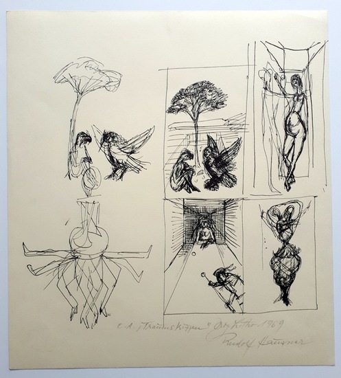 Rudolf Hausner - Traumskizzen 1969 - orig. Lithografie, e.a. signiert und datiert 1969. Rudolf Hausner Traumskizzen, 1969 - Lithografie, Papiergröße: 27,2 x 30,5 cm, signiert und datiert von Rudolf Hausner. E.A. (Proben für die Künstler). Sehr gutes, sauberes Blatt. Rudolf Hausner (1914 in Wien; 1995 in Mödling) war ein österreichischer Maler, Grafiker und Vertreter der Wiener Schule des Phantastischen Realismus. Er gründete mit Edgar Jené, Ernst Fuchs, Wolfgang Hutter etc. eine surrealistische Gruppe im österreichischen Art-Club (1947). Er war im Jahr 1959 Teilnehmer der documenta II in Kassel. 4° Von Autor und Illustrator signiert.