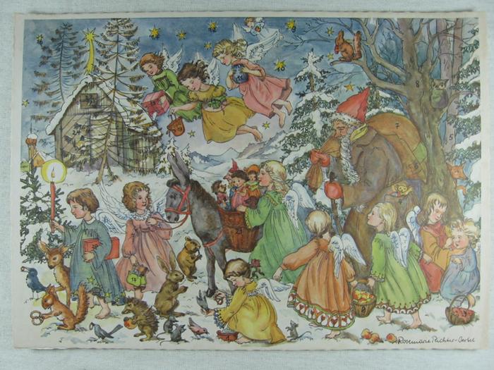 Adventskalender: Weihnachtsmann kommt mit der Engelschar (Vertreterkalender). Nürnberg, Michel., 1965. Farbig illustrierter Adventskalender; quer 21 x 29,5 cm. Ohne Aufdruck auf der Umrandung. Der Kalender erschien unter der Verlagsnummer 15. - Vertreterkalender wurden gedruckt für Handlungsreisende als Verkaufsvorlage bei ihren Kunden. Bei diesen Kalendern wurden die Türchen nicht vorgestanzt und die Hinterklebung wurde rückseitig mit den Bildchen nach außen, also verkehrt herum aufgeklebt, um die Fensterbilder auch zeigen zu können.(ca. 1965). (sehr guter Zustand) - (Lager FF G 1).