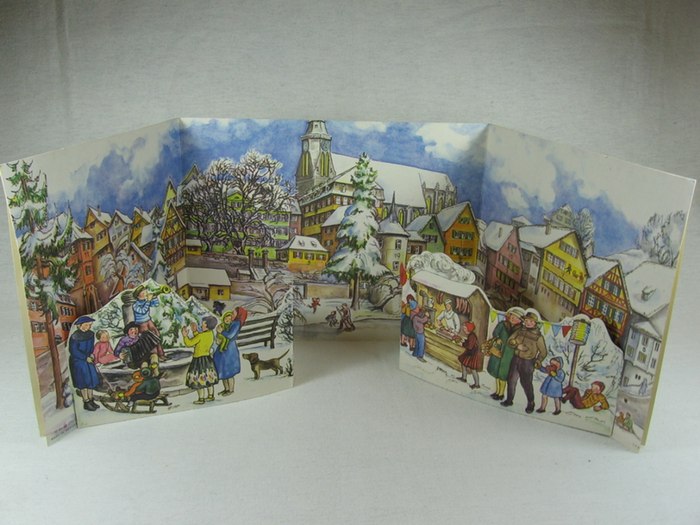 Aufstell - Adventskalender: Vor der Stadt. Stuttgart, Sellmer., 1960. Farbig illustrierter und beglimmerter Adventskalender zum Aufstellen und mit 2 Kulissen, auf denen Kinder am Brunnen musizieren und eine Würstchenbude zu sehen ist; quer 69 x 21 cm. Made in Western Germany. By (Verlagslogo) Order Nr. 208.(ca. 1960). (nicht alle Türchen geöffnet, von einem Doppelfenster fehlt eine Seite, sonst sehr guter Zustand) - Lager FF G 4).
