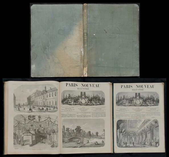 Paris nouveau illustré. Paris, (1864?). 37x26,8 cm. 208 S.; S. 225-240. Mit vielen Holzstichillustrationen und Plänen. Schlichter Leinenband der Zeiot. No. 1-13 in 1 Band, no. 15 lose beiliegend. (Einband berieben und wasserfleckig. Leinen am Rücken stellenweise abgeschabt. Obere Ecke durchgehend bestossen).