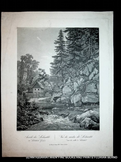Sachsen, (S?chsische Schweiz) Ansicht der LOCHM?HLE an der Wesenitz im Liebethaler Grund Dresden, Verlag Gaspare Weiss & Comp., um 1825. Ansicht, originale Druckgrafik, Radierung, Aquatinta von Conrad Caspar RORDORF (1800-1847) nach Johann Christian Clausen DAHL (1788-1857), Blattformat ca. 42 x 32 cm, Darstellung ca. 29,5 x 24 cm, Zustand etwas staubrandig, Verso alte Montagespuren. Thieme/Becker XXVIII, 590 / Brun IV S. 592-594 Verzeichnis der Stiche von Rordorf fehlt das Blatt, vermutlich selten.