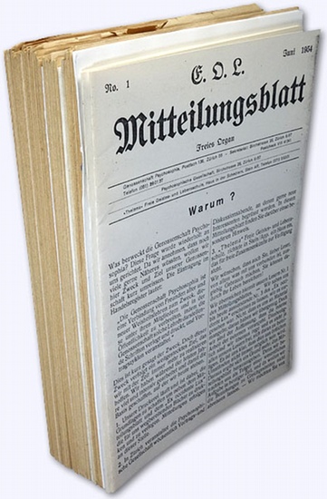 E.O.L. [d.i.: Ex Occidente Lux] Mitteilungsblatt. Nr. 1-74 [kmpl. in 70 Heften; einige erschienen als Doppel- oder Dreifach-Nrn.]. Freies (monatliches) Organ. Zürich (Stein), Psychosophische Gesellschaft, 1954-1960. Zus. ca. 500 S., mit wenigen Abb., 8°, O-Papier (Hefte). Die Vorgängerversion der legendären Oriflamme. Die "Genossenschaft Psychosophia" u. spätere "Psychosophische Gesellschaft" wurde von Hermann Joseph Metzger 1950 als Dachorganisation für den Ordo Illuminatorum, Ordo Templi Orientis (O.T.O.), Fraternitas Rosicruciana Antiqua u. der Ecclesia Gnostica Catholica gegründet. Der Verlag führte dabei die Arbeit der früheren "Thelema Verlagsgesellschaft" in Leipzig weiter. Aus der Verlagswerbung: "Wir wollen kein Dogma predigen, nicht einseitig eine Meinung vertreten, sondern im Gegenteil möglichst aufgeschlossen auf alles hinweisen, das dazu verhelfen kann, sich eine eigene Meinung und Anschauung zu bilden und zum persönlichen Erleben führen." - U.a. mit Beiträgen von: A[nnemarie] Aeschbach; Peter Mano [d.i. Hermann Joseph Metzger]; D. Eggers; E. Harnisch, Frederic Mellinger; A. Borgert; Franz Spunda; E. Klein; Franz Bardon; Aleister Crowley (enthält viele frühe Arbeiten u. Übersetzungen zu Crowley, siehe Nr. 9, 10, 22; 23, 25, 33, 37, 43, 45, 46, 48, 52, 63, 64, 65, 70-71); F. Dressel; Max Rahn; H. de Witt; Gurdjieff; Dr. Herbert Fritsche. Daneben mit Bekanntmachungen (u.a. Todesanzeige für Lanz von Liebenfels) u. vielen Buchbesprechungen. - Wenige Blatt angerändert; alle papierbedingt gebräunt, sonst gute Expl. - Sehr selten.