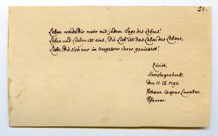 Eigenh. Albumblatt mit U. Zürich, 11. September 1790. 1 S. Qu.-schmal-8vo. ?Leben werde dir mehr mit jedem Tage des Lebens! | Leben und Lieben ist eins. Die Lieb? ist das Leben des Lebens; | Liebe, die sich nur im vergessen ihrer geniesset!? ? Papierbedingt leicht gebräunt und mit einer kleinen Numerierung am rechten oberen Rand der Recto-Seite; stellenweise schwach fleckig.