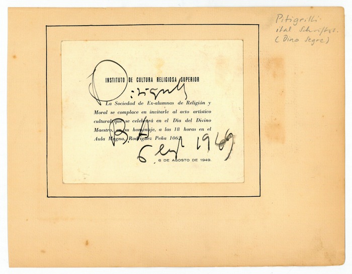 Albumblatt mit eigenh. U. B[uenos] A[ires], 6. August 1949. 1 S. Qu.-kl.-8vo. Montiert. Einladungskarte des ?Instituto de Cultura Religiosa Superior?. ? 1938 zog Segre wegen seiner jüdischen Herkunft zunächst in die Schweiz und später nach Argentinien. Nach seiner Rückkehr nach Italien, wandte er sich dem Katholizismus zu und wandte sich gegen die Neuauflagen seiner Romane.