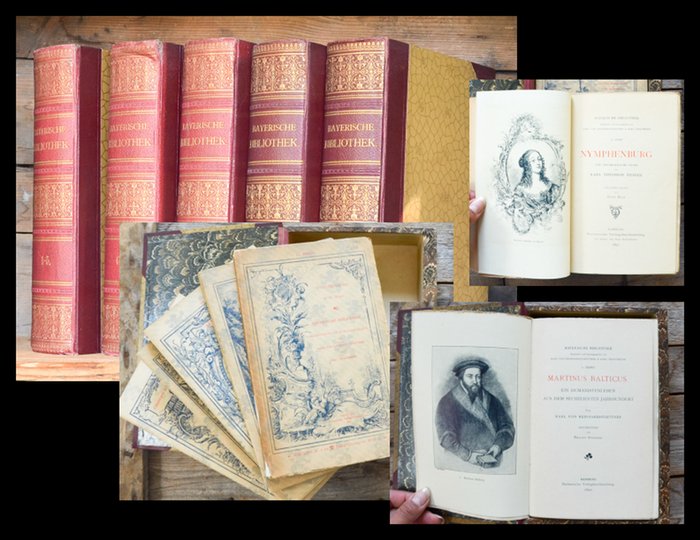 Bayerische Bibliothek. Herausgegeben von K von Reinhardstoettner und K. Trautmann. 1-25 in 25 Heften in 5 Kassetten. Bamberg, Buchner, 1890, 1891. 8°., Je etwa 80-120 Seiten, mit einigen Tafeln. Illustrierte Original-Broschur Lentner 2868 (nennt 29 Bände). Sammlung von Monographien über bayerische Staatsmänner, Humanisten, Künstler und Wissenschaftler, wie Balticus, Pocci, Peter Candid, Westenrieder, Behaim, Rückert, Sachs, Horschelt, Aventin, Stieler, Wagner und zu Städten, Orden, Schlössern, Kirchen und Museen wie z.B. Hausritterorden vom Heiligen Georg, Schloß Nymphenberg etc. Hier die Hefte 1-25 von wohl insgesamt 30 erschienenen. - Sehr schöne Reihe, nur ein Heft am Rücken mit Fehlstellen, sonst geringe Gebrauchsspuren. Die Kassetten teils berieben, aber sehr dekorativ. - In diesem Umfang sehr selten.