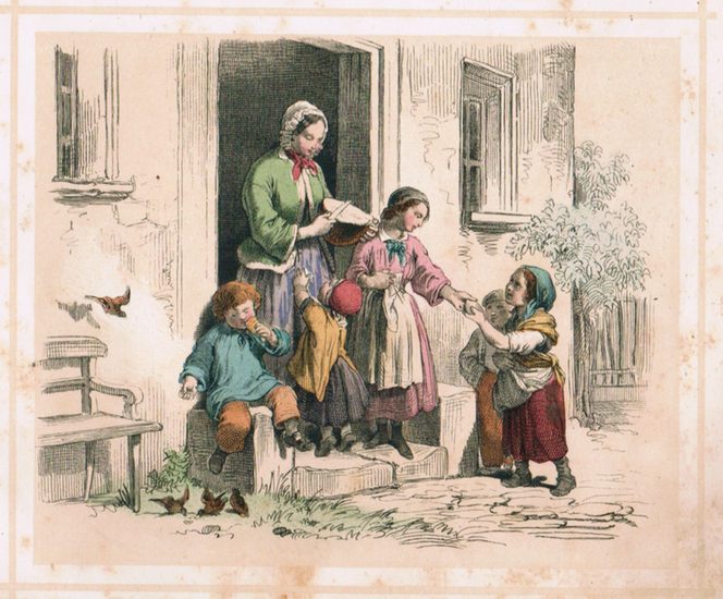 Das liebe Brod. Mit 12 kolor. getönten lithogr. Tafeln (v. Theod. Rothbart) gezeichnet v. Ferdinand Rothbart. Stuttgart, Scheitlin, (1854). Quer-8°. 43(3) S. HLn. d. Zt. (berieben, bestoßen, lichtrandig, Kapitale beschabt u. Reste m handschriftl. RSch.). Klotz 651/6. Seebaß, NF 240: "Originalausgabe". Nicht bei Wegehaupt. - "Der Werdegang des Brotes von der Kornaussaat bis zum Verkauf wird in hübschen Versen und ansprechenden Bildern geschildert." (Seebaß). - Die Schriftstellerin Isabella Braun (1815-1886) war seit 1837 Volkschullehrerin u. begann, v. Christoph von Schmid angeregt, Jugendbücher zu schreiben. Sie gründete u. leitete in München die 'Jugend-Blätter für christliche Unterhaltung und Belehrung", zu deren Mitarbeiter später u.a. Franz Graf Pocci gehörte. (vgl. DBE 2, 82). - Papierbedingt minimal gebräunt durchgehend stockfleckig, es fehlt das Bl. 33/34, die lithogr. Tafel von der Mühle ist lose, mit stärkeren Randläsuren im w. Rand u. mit 2 Ausrissen mit Fehlstelle im Himmel. Die Figuren aller Tafeln im Vordergrund kräftig, die dichte Staffage im Hintergrund zarter koloriert.