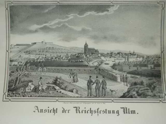 Bundesfestung. "Ansicht der Reichsfestung Ulm". Lithographie "nach der Natur gezeichnet bei A. Dick Ulm",. um, 1860. 24 x 38 cm. (Aufgezogen, Einrisse oben und rechts, jedoch fachmännisch restauriert, rechts etwas fleckig). Schefold 10208. Gesamtansicht der Festungsanlagen. Im Vordergrund Militärpersonen und Bürger sowie der Zeichner. Auf der Donau Flöße und eine Fähre.