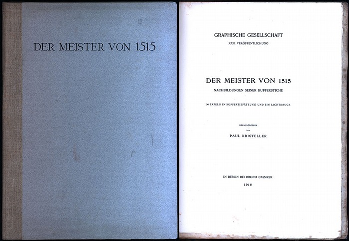 Der Meister von 1515. Nachbildungen seiner Kupferstiche. 36 Tafeln in Kupfertiefätzung und ein Lichtdruck. Berlin, Bruno Cassirer, 1916. Groß-4°. 39 x 28,5 cm. 8 Seiten, XXXVII Tafeln, davon 2 doppelblattgroß. Original-Halbleinenband. (= Graphische Gesellschaft, 22. Veröffentlichung]. 1. Auflage. Textseiten noch nicht aufgeschnitten. Einband etwas fleckig und an den Kanten gebräunt. Blätter braunfleckig. Noch gutes Exemplar.