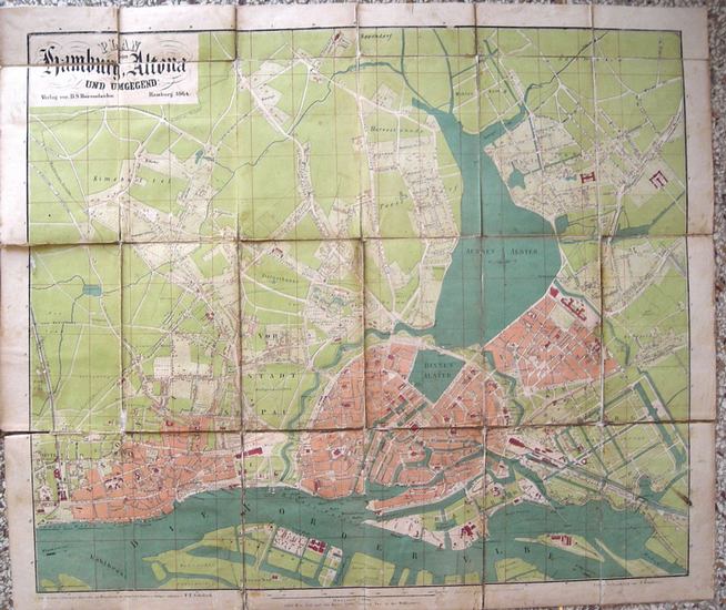 Plan von Hamburg, Altona und Umgegend. Hamburg, 1864. Hamburg, H.S.Berendsohn, 1864. Leinenmäppchen mit Goldprägung, 8°, mehrfarbige, mehrfach gefaltete Karte, Lithographie von J.Guntrum, 53x60 cm, auf Leinen montiert, 1 Bl Register; - Mappe berieben, Leinenkaschierung vermutlich privat, etwas fleckig und berieben. Detaillreiche, frühe Straßenkarte von Hamburg und Altona.