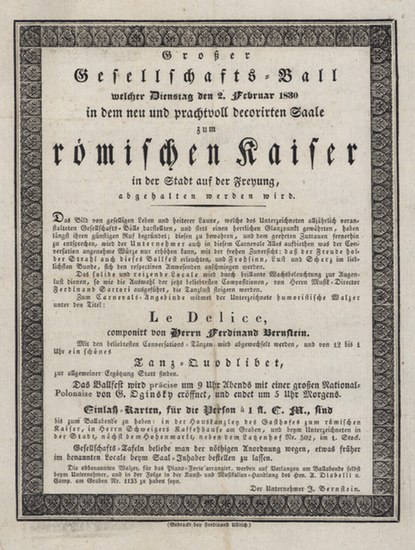 Großer Gesellschafts-Ball ... in dem neu und prachtvoll decorirten Saale zum römischen Kaiser ... auf der Freyung. Flugblatt. Wien, J. Bernstein, Druck Ferdinand Ullrich, 1830. 4°. 1 Seite, einseitig bedruckt im ornamentierten Rahmen, 1. Einladung zur Faschingsaufführung von 'Le Delice' von Bernstein und Tanzmusik von Ferdinand Sartori in dem Saal, der auch Ludwig van Beethoven für Aufführungen gedient hat (heute Renngasse 1). - Schönes Exemplar.