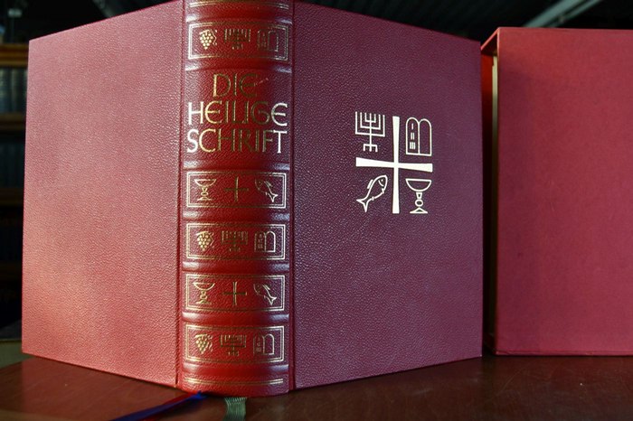 Die Heilige Schrift des Alten und Neuen Testaments nach der Übersetzung Martin Luthers. München, Südwest, 1966. 1575 S. mit 96 Bildtafeln 30 x 22 cm, Leder mit umlaufenden Goldschnitt im Schuber. Schuber berieben, bestoßen und angeschmutzt. Schnitt etwas berieben. Die Familienchronik ist unbenutzt.