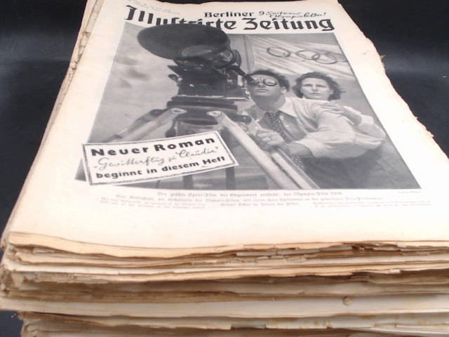 Berliner Illustrirte Zeitung 1936. [Illustrierte] Berlin; Ullstein, 1936. Je Ausgabe zwischen ca. 28 und ca. 48 Seiten, mit zahlreichen Abbildungen. Gr.-4° (=35-40cm), Softcover (nicht geheftet). Berliner Illustrirte [Illustrierte] Zeitung. Vollständige Sammlung mit allen 53 Ausgaben des Jahres 1936/45. Jahrgang. 12 Hefte mit Besitzvermerk. Meist mit (starken) Randläsuren, teils fleckig, teils knickspurig. Einige Hefte beschmutzt, teils mit kleinen Fehlstellen (kein Textverlust). Heft 1, 5 ,45 ,53 beschädigt.