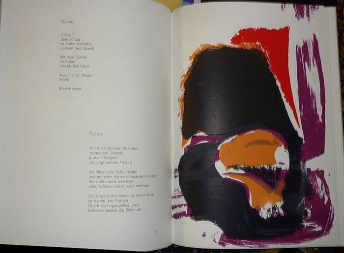 Das entzweite Gesicht. Auswahl 1949-1974. Mit einem Impromptu von Rita Bischof u. sieben farbigen Original-Graphiken von Rainer Tschernay. (Berlin), Edition Malodor, 1996. Imperial-Folio (43 x 30 cm). Mit 7 sign. farb. OGraphiken v. Rainer Tschernay. 53 S., 1 Bl. OHlwd. m. Deckeltitel im Pp.-Schuber. Eines von 50 numer. Ex. (Gesamt 70), vom Verfasser u. Künstler im Impressum signiert. - Vollkommen frisch.