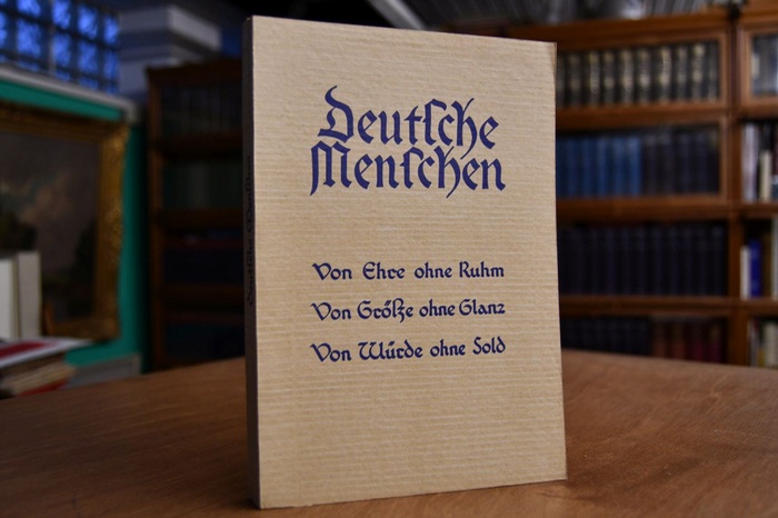 Deutsche Menschen. Eine Folge von Briefen. Luzern, Vita Nova, 1937. 2. Auflage 116 S. 20 x 14 cm, Broschur. Einband berieben. Schnitt fleckig. Am Anfang etwas fleckig. Veröffentlichung Benjamins während der Zeit seines Exils. Um die Verbreitung des Buches zu sichern, ließ Bejamin auf den Deckel in frakturähnlicher Schrift drucken: "Von Ehre ohne Ruhm/ Von Größe ohne Glanz/ Von Würde ohne Sold".