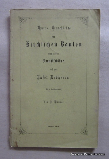 Kurze Geschichte der kirchlichen Bauten und deren Kunstschätze auf der Insel Reichenau Konstanz, Stadler, 1873. Mit 8 gefalteten lithographischen Tafeln. IV, 46 S. Orig.-Umschlag; minimal fleckig u. mit leichten Gebrauchsspuren. Erste Ausgabe. Die Tafeln zeigen Monstranzen, Reliquienschreine etc. und eine Gesamtansicht der Klosterinsel nach dem Gemälde in der Reichenauer Münsterkirche. - Auf dem Umschlag werden 8 Steindrucktafeln genannt, auf dem Titelblatt 9. - Durchgehend etwas stockfleckig.