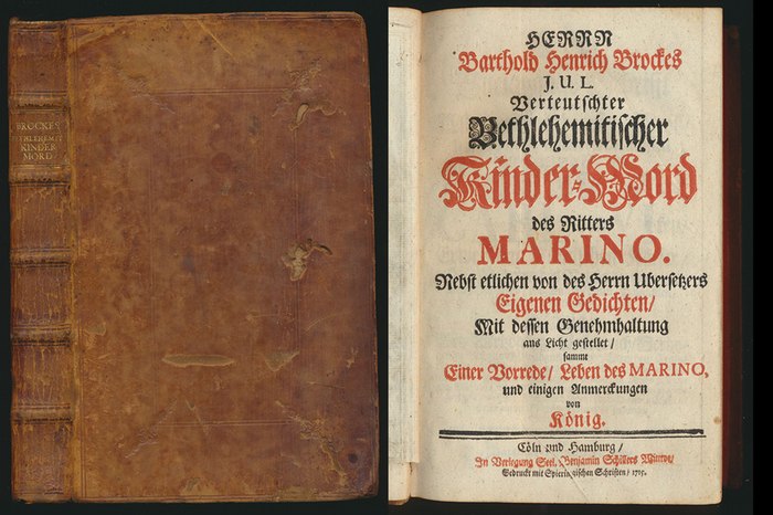 Herrn Barthold Henrich Brockes J. U. L. Verteutschter Bethlehemitischer Kinder-Mord des Ritters Marino. Nebst etlichen von des Herrn Ubersetzers Eigenen Gedichten, Mit dessen Genehmhaltung ans Licht gestellet, sammt Einer Vorrede, Leben des Marino, und einigen Anmerckungen von König. [Erstausgabe / first edition]. Coeln und Hamburg, In Verlegung Seel. Benjamin Schillers Witwe, 1715. 8°. 21,0 x 13,5 cm. Frontispiz, gefaltetes Kupfer, Titelblatt in Rot und Schwarz, [23] Blatt, XL Seiten, [3] Blatt, 360 Seiten. Hellbrauner Ganzlederband der Zeit mit goldgeprägtem Rückentitel. Rundum-Rotschnitt. Erste Ausgabe. VD18 10219951. Dünnhaupt 11.4. WG 3. Zweisprachige Ausgabe. Deutsch und Italienisch. Mit dem gestochenen Porträt Brockes von Denner nach Bernigeroth als Frontispiz und dem mehrfach gefalteten Kupfer von B. Picart, 4 gestochenen Kopfvignetten (davon 3 doppelt gedruckt), 1 gestochenen Initiale, und 3 gestochenen Schlußvignetten (jeweils doppelt) sowie zahlreichen Vignetten in Holzschnitt. Einband wenig berieben, 4 kleinere Wurmlöcher, gutes, innen sehr gutes Exemplar.