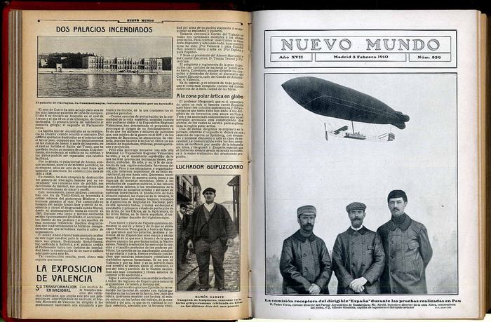 Nuevo Mundo. Madrid, 1910. Ca. 28 x 21 cm. Umfangreich illustriert. Rote Halblederbände der Zeit. Heft 835 (Januar 1910) bis Heft 886 (Dezember 1910. Rücken berieben und bestoßen. Hefte in unterschiedlichen Papierqualitäten (einfaches Papier und Kunstdruckpapier), teils gebräunt. Wochenzeitschrift in spanischer Sprache. Mit Artikeln zur Luftfahrt, Stierkampf, Militär, Zeppelin, Skifahren, Theater, Adel, Politik etc. Aufgrund der EU-Verpackungsrichtlinie können wir nicht nach Spanien liefern.