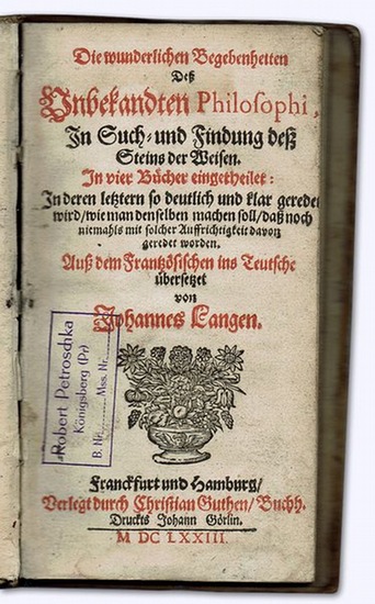 Die wunderlichen Begebenheiten Deß Unbekandten Philosophi, In Such- und Findung deß Steins der Weisen. In vier Bücher eingetheilet: In deren letztern so deutlich und klar geredet wird / wie man denselben machen soll / daß noch niemahls mit solcher Auffrichtigkeit davon geredet worden. Auß dem Frantzösischen ins Teutsche übersetzet von Johannes Langen. Dtsch. Erstausg. Franckfurt u. Hamburg, Verlegt durch Christian Guthen/Buchh. druckts Johann Görlin., 1673. 143 S., Titel in schwarz/rot u. mit Holzschnittvignette (Blumenstück), Kl.-8°, Pergament d. Zt. mit handschrftl. Rückentext. VD17 3:001019M; Brüning 2255; Ferguson II,556; Duveen 65 Anmerkung; Ferchl 591. - Die erste deutsche Übersetzung des zuerst 1646 in französisch erschienen Werkes "Les Aventures du Philosophe Inconu, [...]", das allegorisch das Große Werk darstellt. Verf. ermittelt nach Bircher, B 16868. - Beanspruchter Einband: fleckig, bestossen, verzogen, mit einem Abriss des Pergaments u. ein wenig "zu gross" (enthielt vermutlich ursprünglich noch ein weiteres Werk); Innendeckel mit Kleberresten; Vorsätze u. Titel etwas angeschmutzt; Titel gestempelt; tls. mit ganz schwachem Feuchtigkeitsrand; einige alte Anstreichungen u. kl. Marginalien (nicht allzu viele), sonst ein gutes Expl. Von interessanter Provenienz: Vorsatz mit ExLibris-Stempel des Wiener Psychoanalytikers Herbert Silberer (1882-1922, der für seine Arbeiten über alchemistische Symbolik bekannt ist) sowie zwei Stempel von Heinrich Tränker (alias Br. Recnartus, 1880-1956, (antiquarischer) Buchhändler u. engagierter Okkultist: Sekretär in der I.T.V.; Mitglied im OTO; Gründer versch. rosenkreuzerischer u. pansophischer Gruppierungen, woraus tlw. die Fraternitas Saturni hervorging; zunächst fasziniert von Aleister Crowley, vom dem er sich aber scharf entzweite).