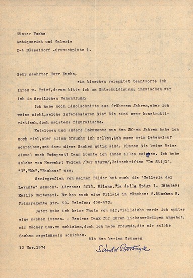 Brief an den Antiquar Günter Fuchs. [Autograf, signierter Brief / autograph, signed letter]. _. Sándor [Alexander] Bortnyik, geb.1893 in Marosvásárhely, Österreich-Ungarn, gest. 1976 in Budapest, ungarischer Maler un Maschinengeschriebener 20-zeiliger Brief von Sándor Bortnyik an den Düsseldorfer Antiquar Günter Fuchs, datiert 13 Nov. 1974, unten mit blauem Kugelschreiber von Sándor Bortnyik signiert. Blattgröße: 29,4 x 20,8 cm. Blatt mittig mit einer vertikalen Knickspur. Sehr guter Zustand. Typewritten 20-lined letter by Sándor Bortnyik in German to the antiquarian bookseller Günter Fuchs (Düsseldorf, GER), dated 13 Nov. 1974, signed below with blue ballpoint pen by Sándor Bortnyik. Sheet size: 29.4 x 20.8 cm. Sheet in the middle with one vertical crease mark. Fine condition.
